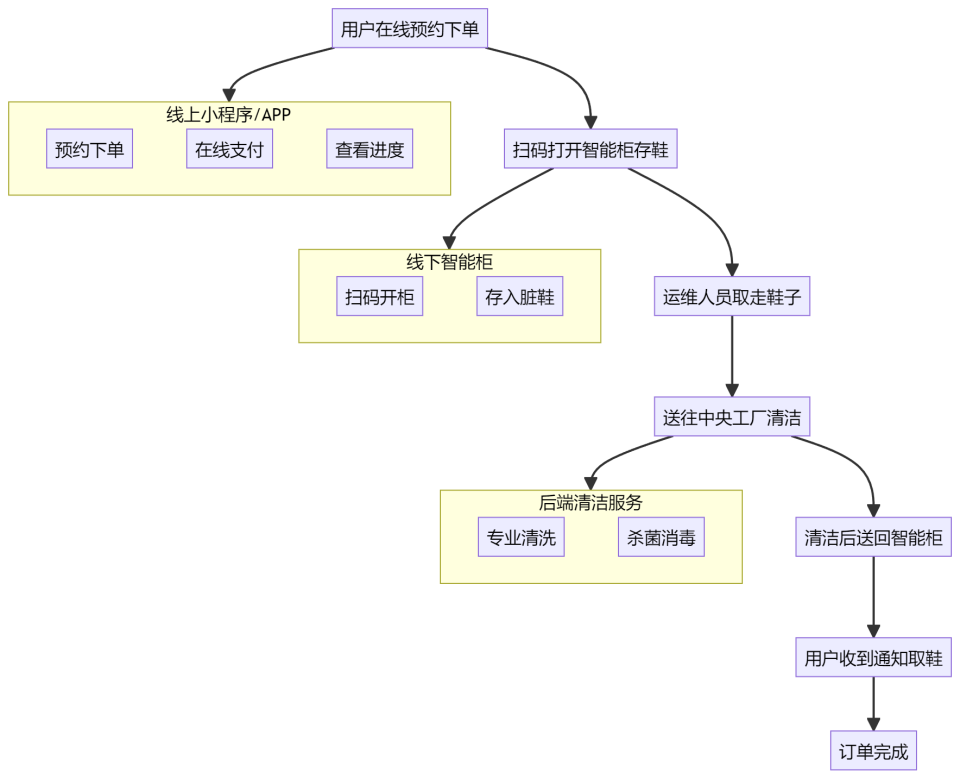 它的核心工作模式,是通过线上小程序与线下智能柜的结合,并依托后端清洁服务,形成了一个完整的闭环。具体流程如下图所示: